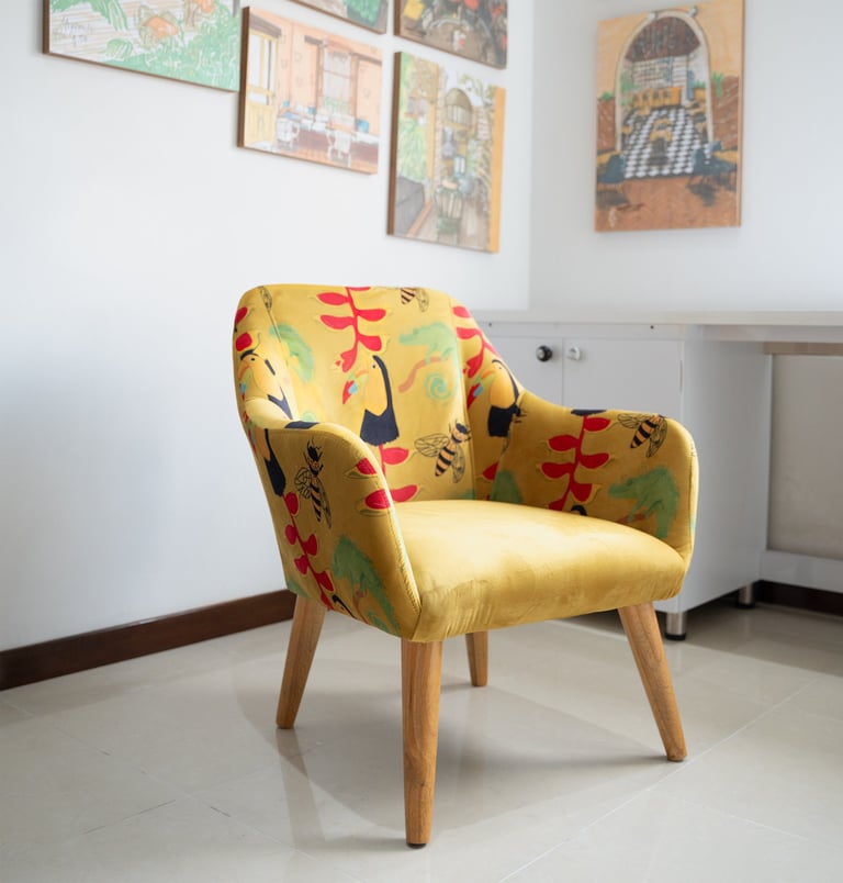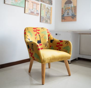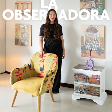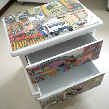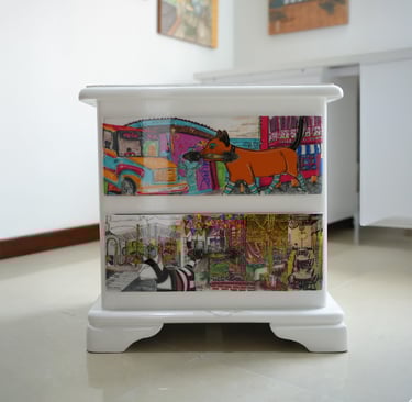Este nochero de madera restaurado reúne ilustraciones de espacios interiores y escenas cotidianas de Cali. Cada cara funciona como una pequeña ventana a la ciudad, a sus atmósferas y ritmos. La pieza mantiene su función original, pero incorpora la ilustración como una capa narrativa que conecta el objeto con el territorio.